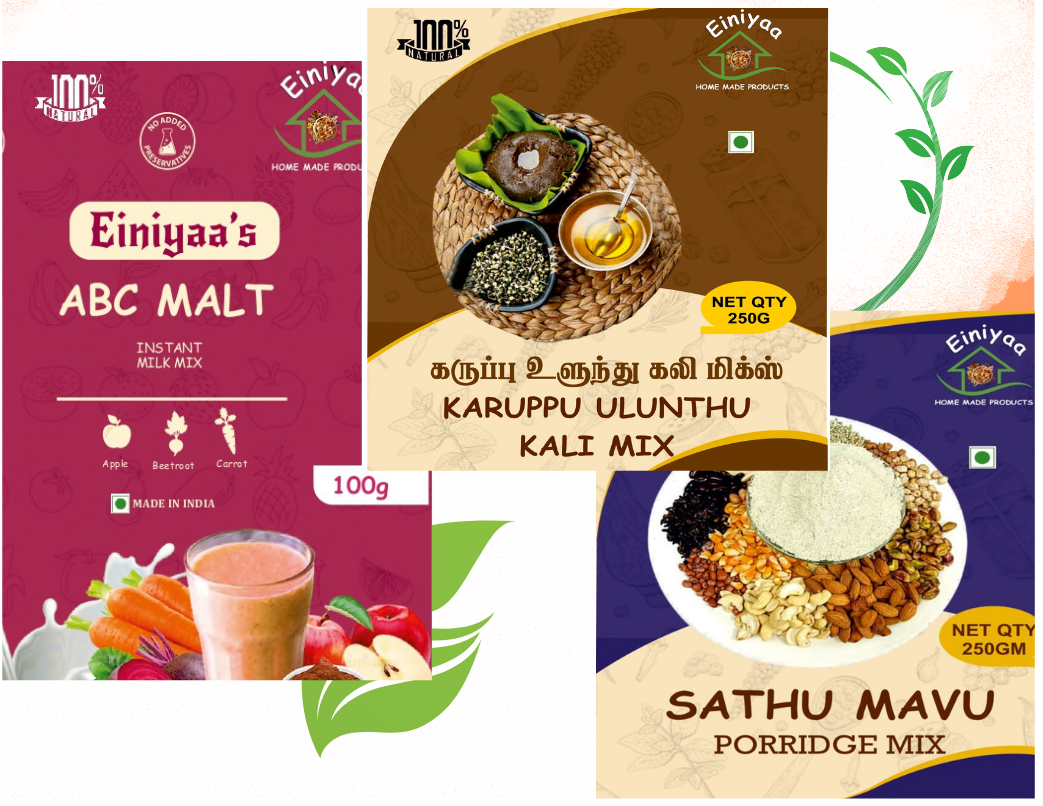 A perfect family combo with Karuppu Ulunthu Kali Mix for strength and bone health, Sathu Mavu Porridge Mix for daily multigrain nutrition, and ABC Malt (Apple-Beetroot-Carrot) for boosting immunity and vitality. 100% natural, homemade, and preservative-fr