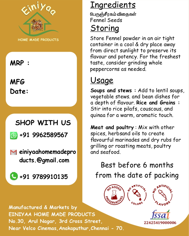 100% Fennel Seeds (பெருஞ்சீரகம் விதைகள்)