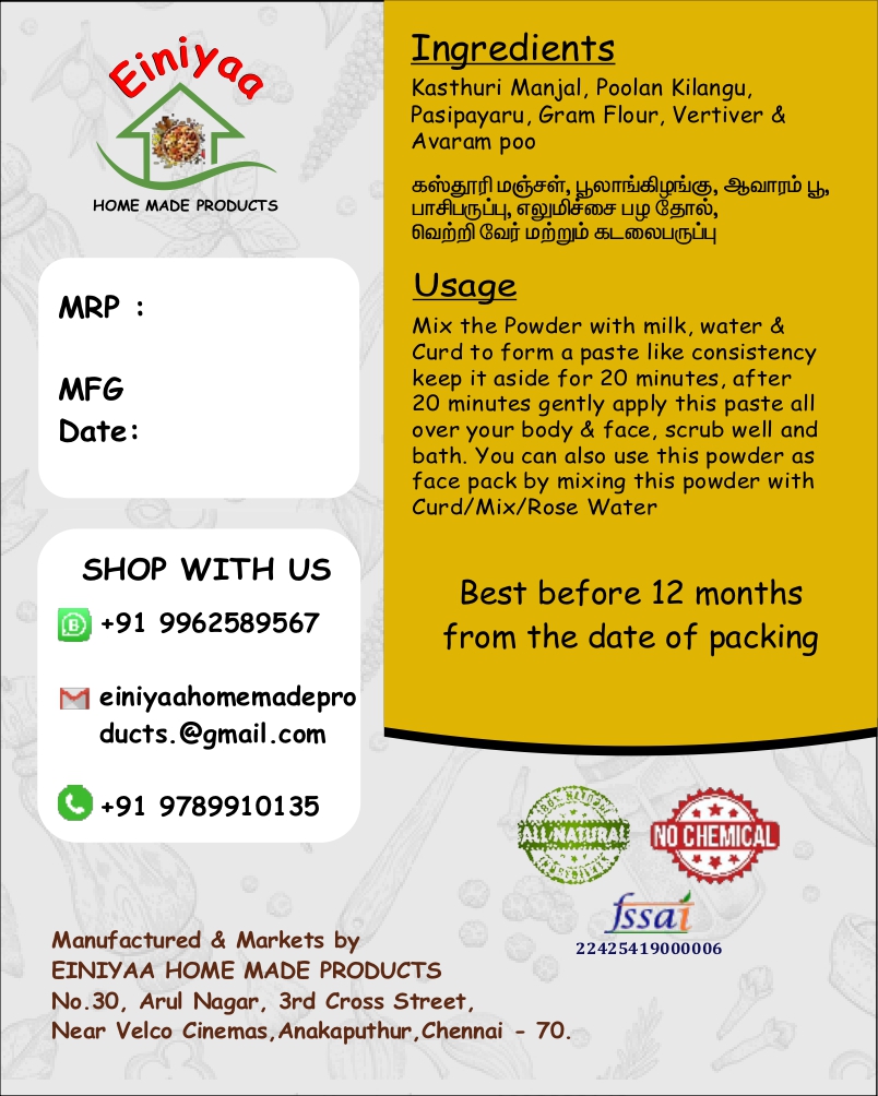 Kasthuri Manjal, Poolan Kilangu, Pasipyaru, Gram Flour, Vetiver & Avaram Poo